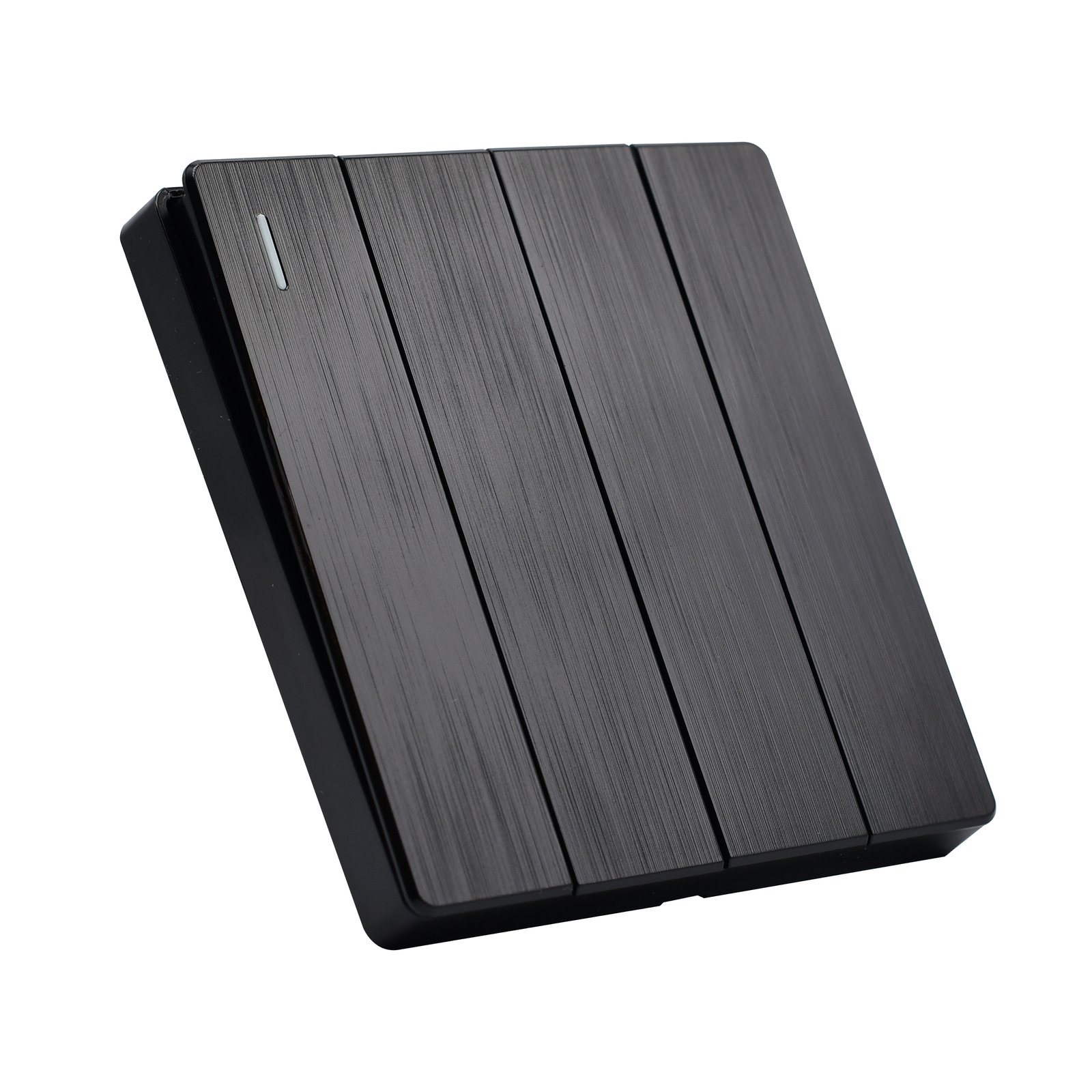 مفتاح كهربائي رباعي بلون أسود فاخر، يحتوي على أربعة أزرار تشغيل مستقلة، مصمم للتحكم بأربع دوائر كهربائية من نقطة واحدة. يتميز بتصميم معدني مصقول يضفي لمسة من الفخامة والعصرية على المساحات الداخلية، ويُعد خيارًا مثاليًا للمنازل والمكاتب والفنادق. جودة الصناعة السعودية تضمن أداءً موثوقًا واستخدامًا طويل الأمد.