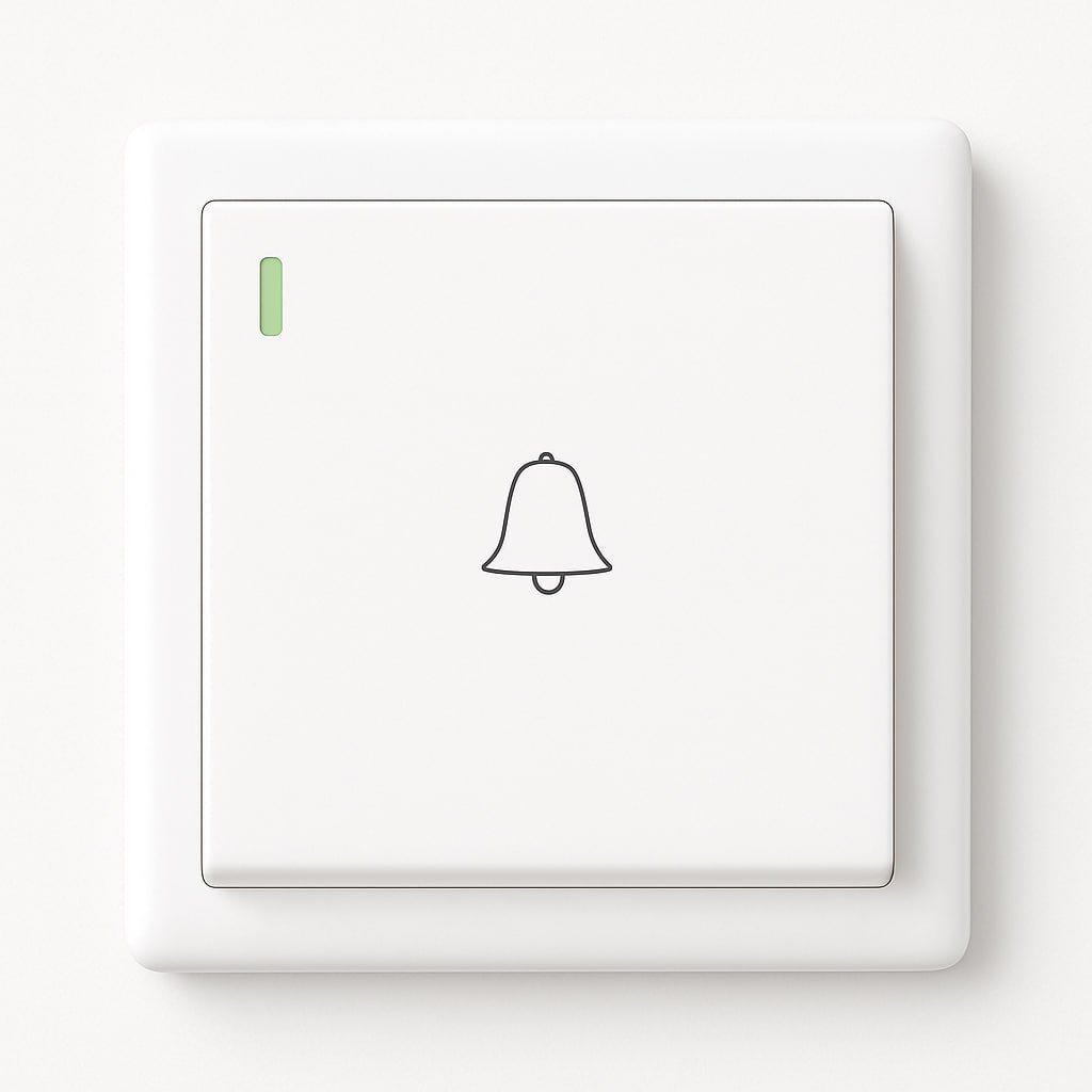 مفتاح جرس من سلسلة M3، بتصميم أبيض ناصع ورمز جرس محفور في المنتصف، مع مؤشر ضوئي أخضر في الزاوية العلوية اليسرى يُضيء عند الضغط. يُستخدم كزر تنبيه أو جرس باب، ويُضفي لمسة من الفخامة على المداخل والممرات. يتوفر بلونين فاخرين: الأبيض الكلاسيكي، والأبيض اللؤلؤي