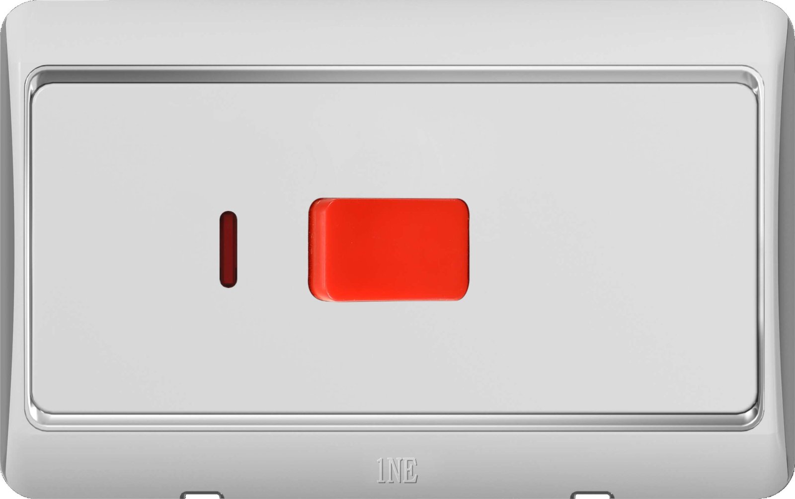 مفتاح مكيف من سلسلة DZ SERIES بقدرة 20 أمبير، مصمم للتحكم في تشغيل المكيفات والأجهزة الكهربائية الثقيلة. يتميز بزر أحمر واضح ومؤشر ضوئي يوضح حالة التشغيل، مع لوحة بيضاء لامعة وإطار معدني أنيق يحمل شعار “1NE”. تصميمه العصري وحوافه المستديرة تضيف لمسة راقية لأي مساحة داخلية، ويجمع بين الأداء العالي والتناسق البصري ضمن الهوية الموحدة للمنتجات الكهربائية الفاخرة.